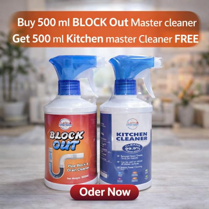Block Out Drain Cleaner পাইপ ও ড্রেনের জমে থাকা ময়লা, চুল, তেল এবং ব্লক পরিষ্কার করতে সাহায্য করে। অন্যদিকে Kitchen Master Cleaner রান্নাঘরের তেল, গ্রিজ ও কঠিন দাগ পরিষ্কার করে কিচেনকে ঝকঝকে রাখতে সাহায্য করে।