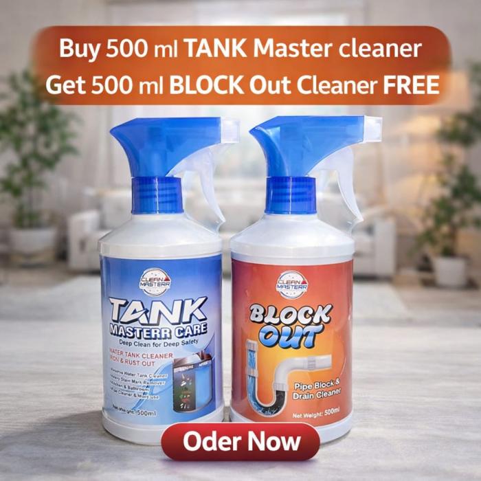 Tank Master Water Tank Cleaner শক্তিশালী ফর্মুলার মাধ্যমে পানির ট্যাংকের জমে থাকা ময়লা, আয়রন দাগ ও মরিচা দূর করতে সাহায্য করে। অন্যদিকে Block Out Drain Cleaner সহজেই পাইপ ও ড্রেনের ব্লক পরিষ্কার করে পানির প্রবাহ স্বাভাবিক রাখে।